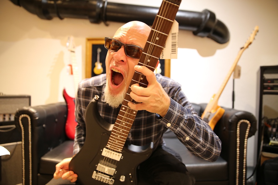 Ma première guitare était une Aria Pro II PE 460, qui était une copie de Les Paul, et qui était d’ailleurs aussi lourde qu’une Les Paul. J'étais plutôt un grand tout maigre, et je me souviens que ça me ruinait l’épaule. Mais j’ai gardé cette gratte super longtemps, parce qu’Aria faisait des super copies. Je me souviens qu’est une guitare pour laquelle ma mère avait payé 400 francs à l’époque (NdR : environ 100 CHF), et que j’avais bariolée pour qu’elle ressemble un peu à une guitare de Van Halen. J’avais aussi un petit ampli Gorilla, et pour la disto je me suis bidouillé une pédale à partir d’un transistor, parce que j’avais lu dans un magazine qu’on pouvait faire ça en utilisant la sortie casque comme input. Ça faisait un son abominable (rires). Et puis ma maman m’a offert la DS-1, la fameuse, quand elle a vu que je passais des heures tous les jours sur l’instrument, et c’était un game-changer.