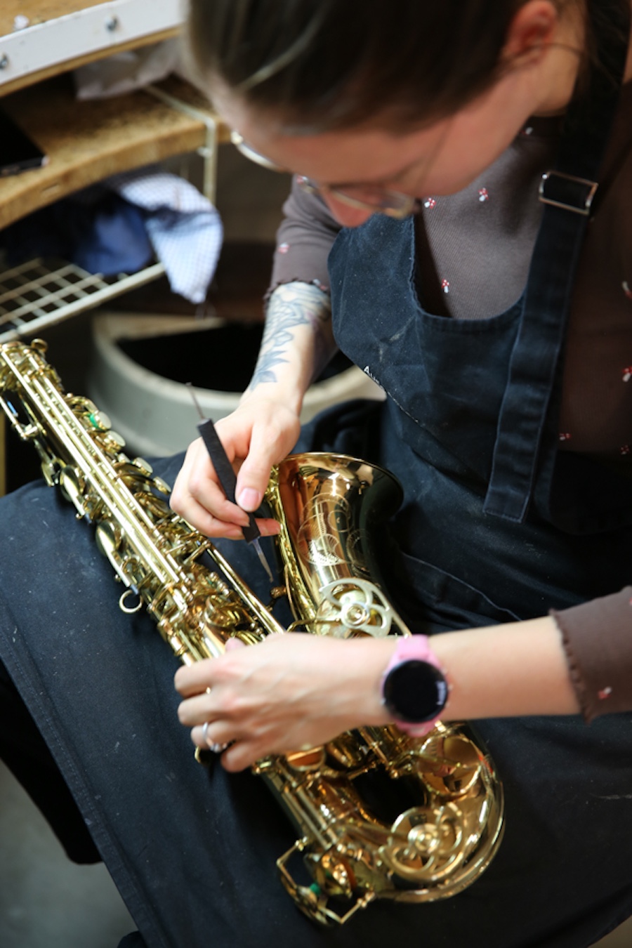 Pendant l'apprentissage j'ai été formée autant dans le domaine des bois que celui des cuivres, pour lesquels j'ai particulièrement apprécié m'occuper des cors. Il y a beaucoup plus de paramètres à prendre en compte dans les cors que dans les autres cuivres, il faut être rigoureux et précis. Mais maintenant que mon apprentissage est terminé, je me spécialise dans les bois, et mon autre "chouchou" je dois dire que c'est la flûte. Les flûtes professionnelles ont des tampons extrêmement précis, cela demande d'être très exigeant dans le tamponnage à l'aide de papier d'épaisseurs fines. C'est difficile mais j'apprécie le challenge ! De plus, ce sont de véritables bijoux, c’est un bonheur de travailler sur ce type d’instruments.