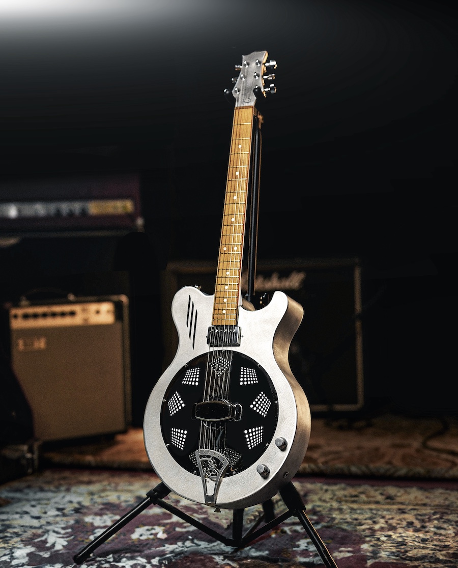 A l’instar de la Motel, je voulais revisiter la guitare à résonateur qui a très (trop) peu évolué depuis sa création dans les années 1920. J’ai pensé à l’équiper de notre innovation qu’est le manche résonant (un manche évidé en aluminium doté d’une touche en bois). Nous ne sommes pas les premiers à proposer un manche en aluminium cependant nous sommes les seuls à proposer un instrument qui résonne du sillet de tête jusqu’au fond de la caisse.